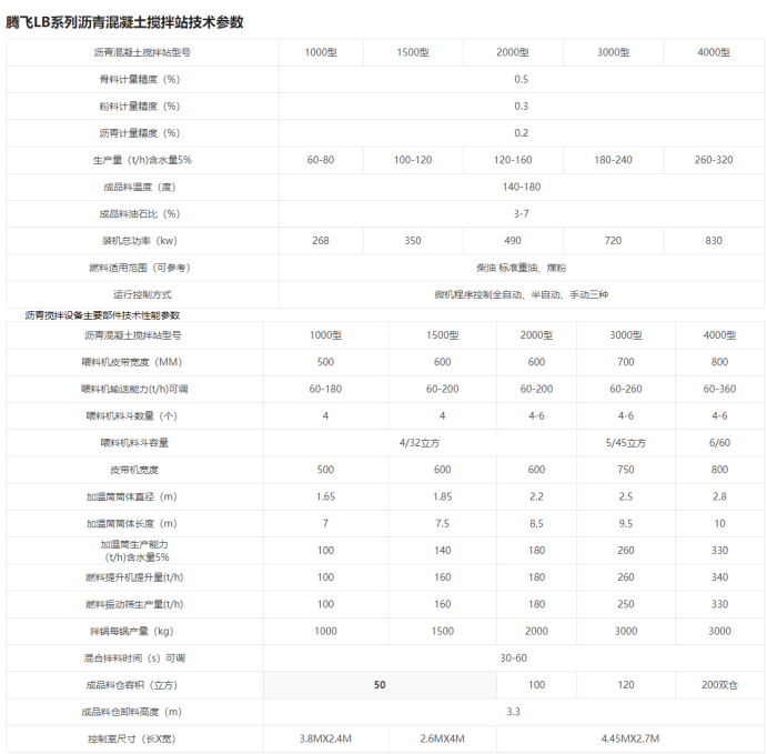 腾飞LB系列沥青混凝土搅拌站基本参数