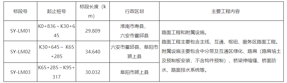 (1)合肥至周口高速公路寿县(保义)至颍上(南照)段路面工程划分为3个施工标段,标段划分如下: