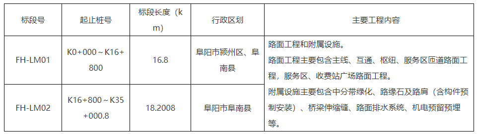 (2)阜阳至淮滨高速公路安徽段路面工程共划分2个施工标段。具体如下: