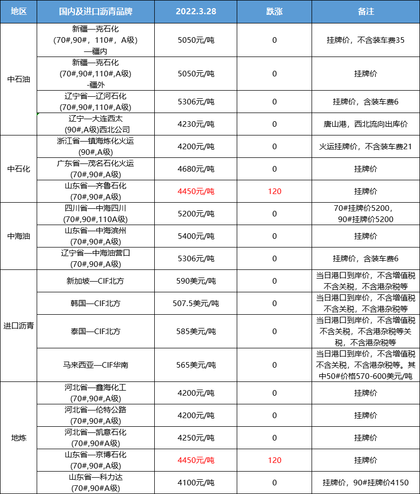 国内及进口沥青产品价格汇总(2022.3.28)
