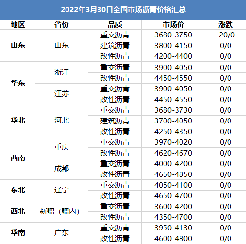 2022年3月30日全国市场沥青价格汇总