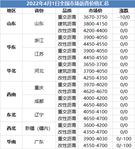 2022年4月1日全国市场沥青价格汇总