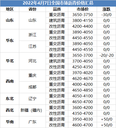 2022年4月7日全国市场沥青价格汇总