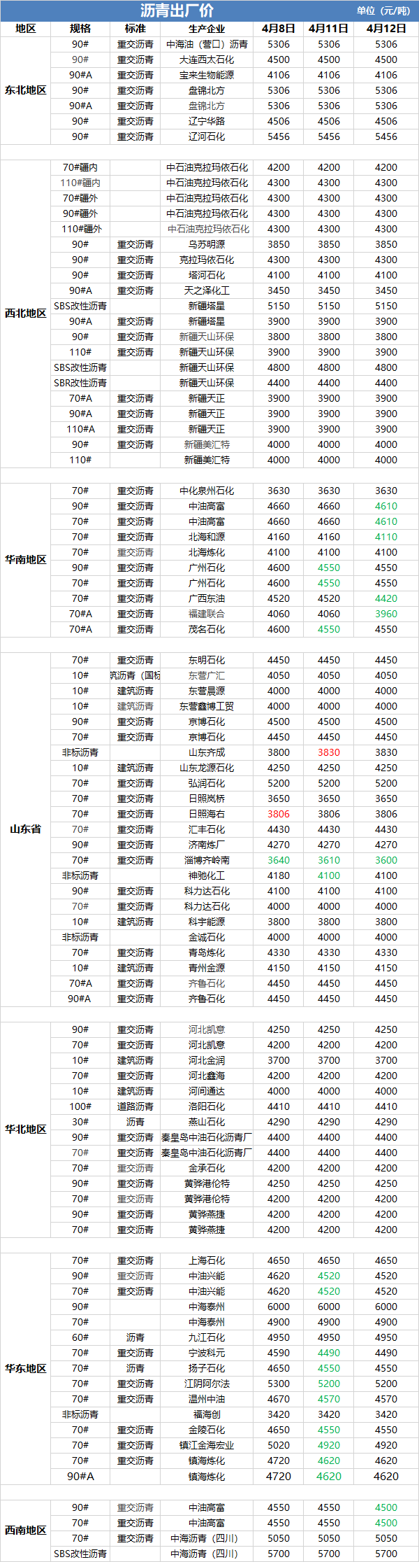 沥青出厂价(4月12日)