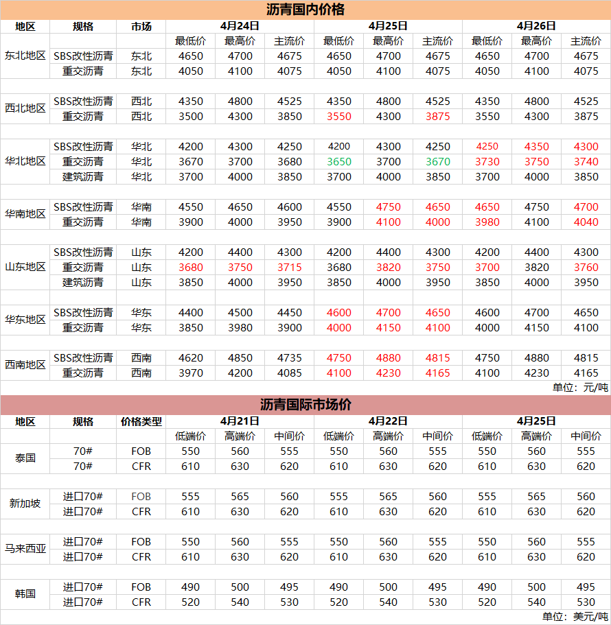 国内(外)沥青价格(4月26日)