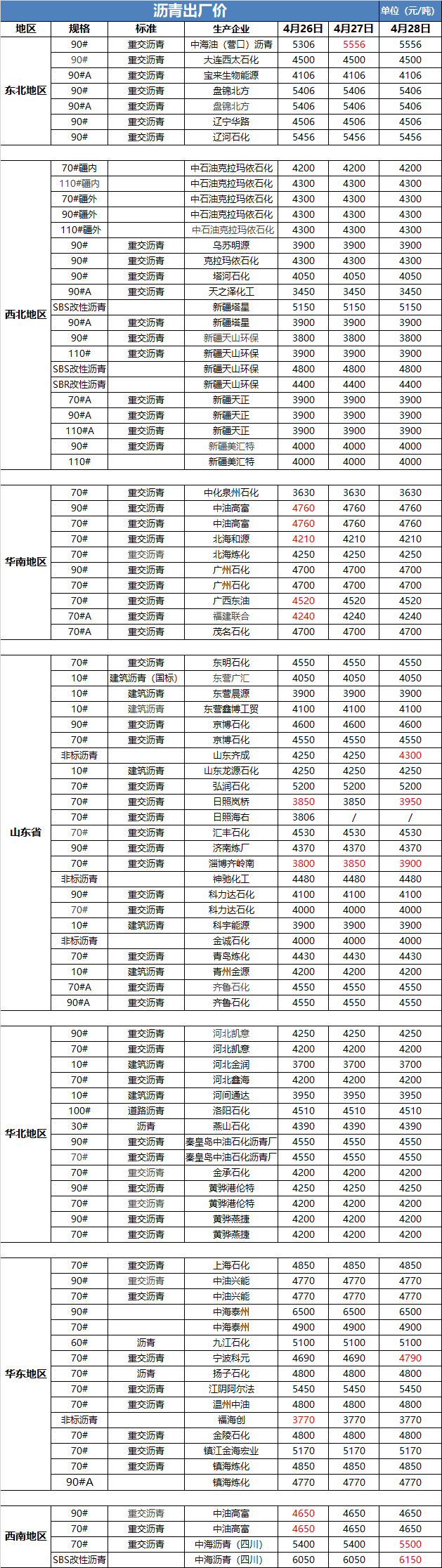 沥青出厂价(4月28日)