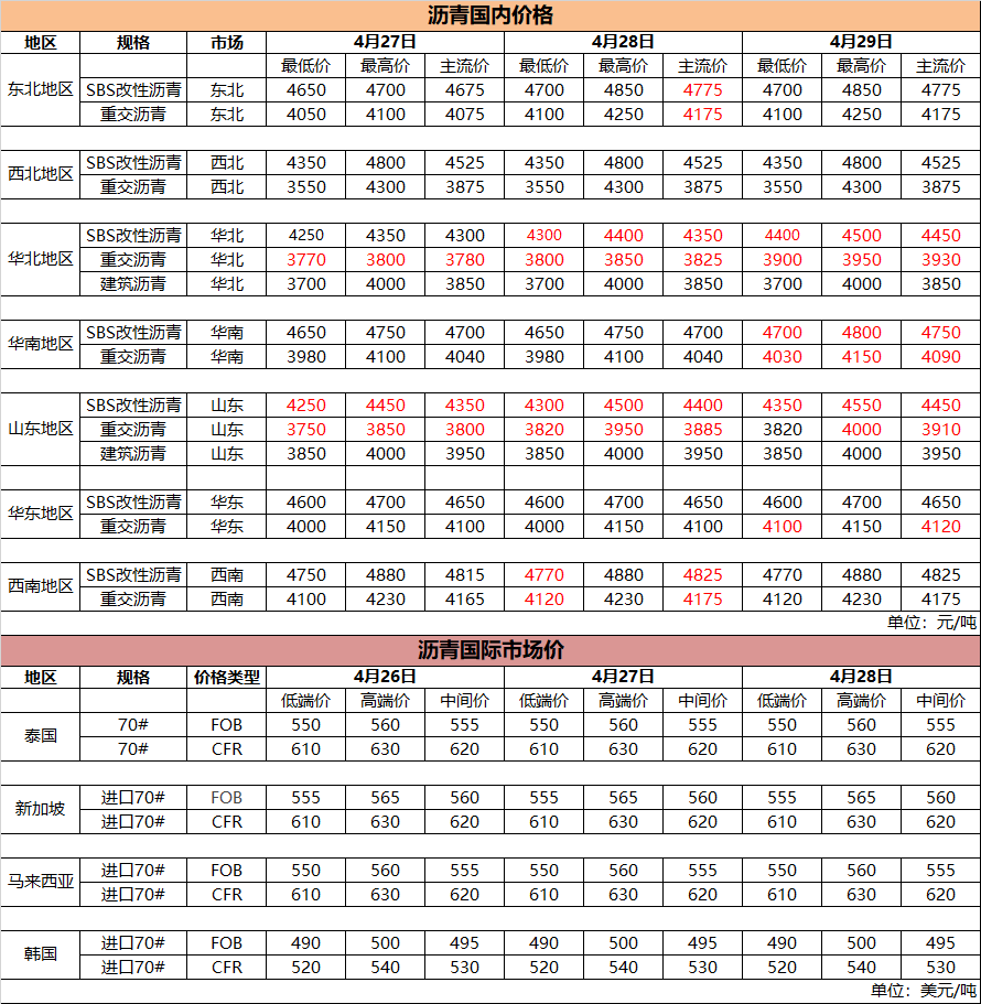 国内(外)沥青价格(4月29日)