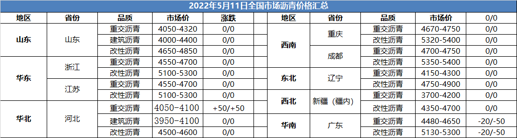 2022年5月11日全国市场沥青价格汇总
