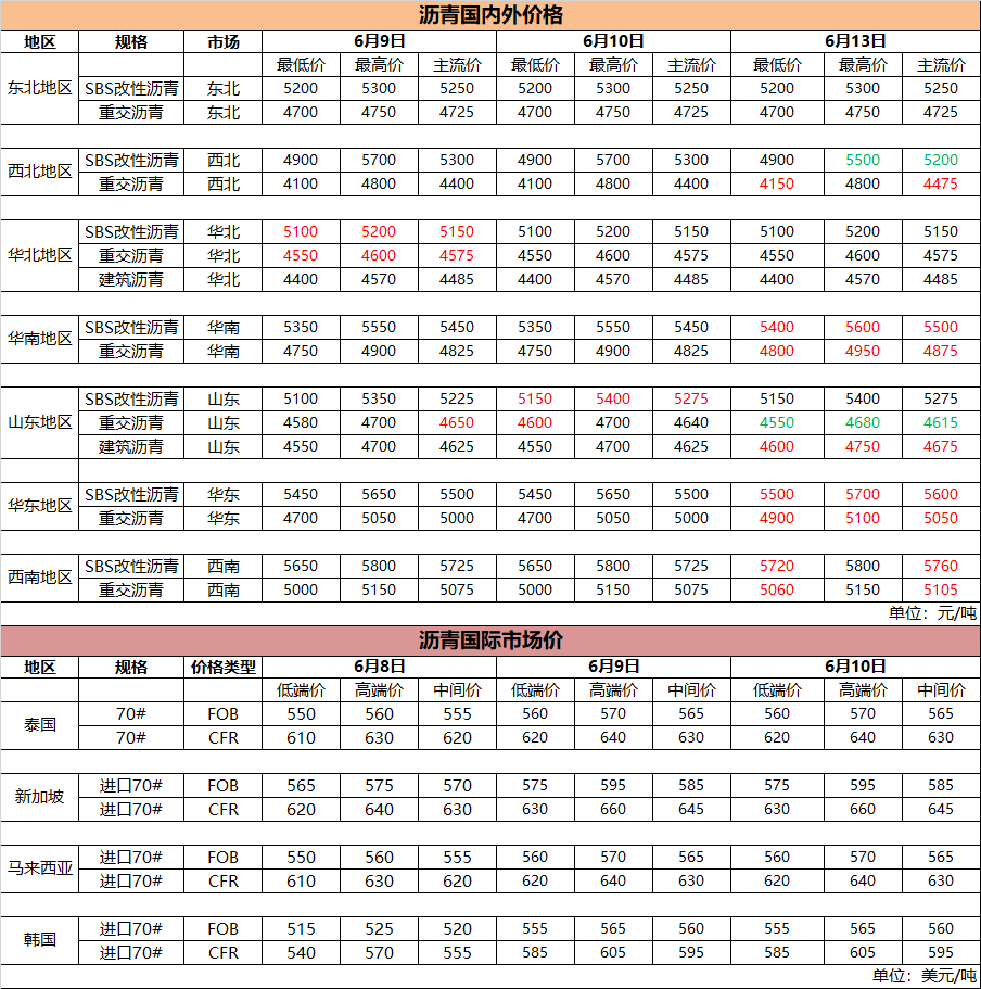 6月13日国内(外)沥青价格