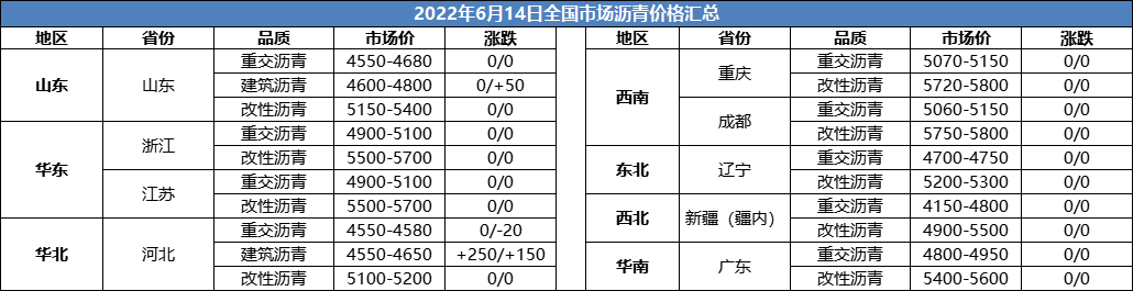 6月14日全国市场沥青价格汇总