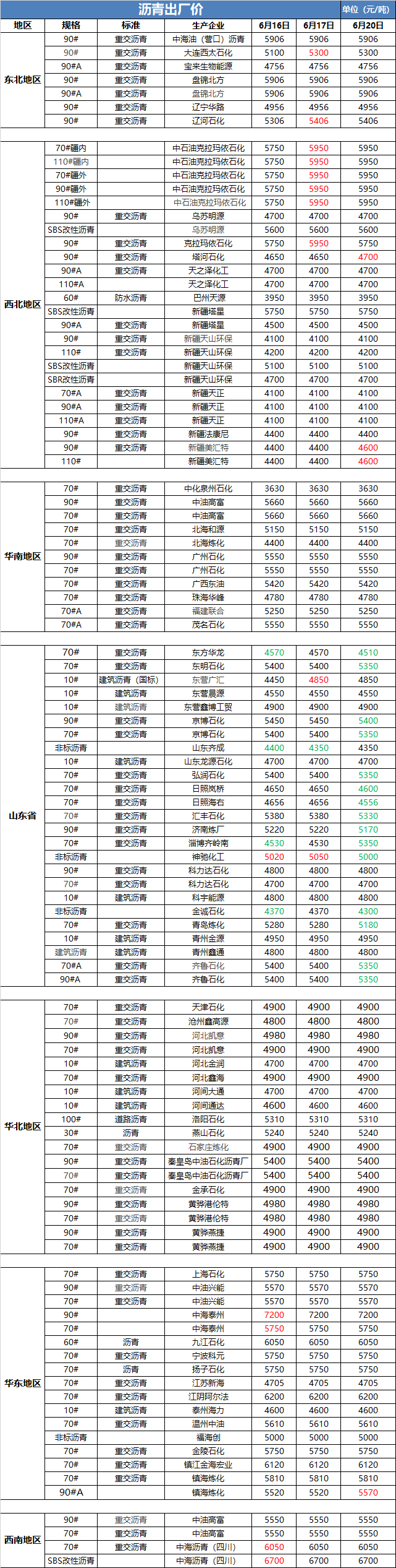 6月20日沥青出厂价