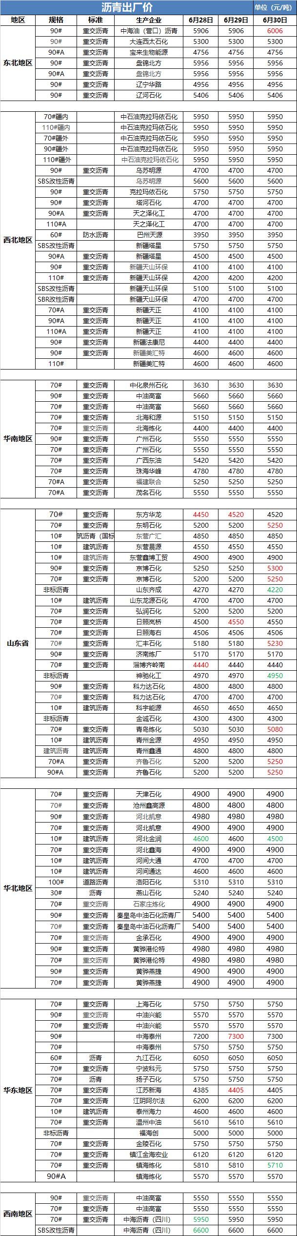 6月30日沥青出厂价