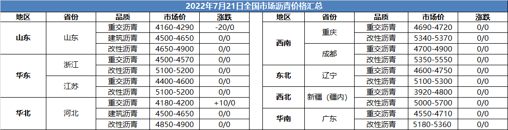 7月21日全国市场沥青价格汇总