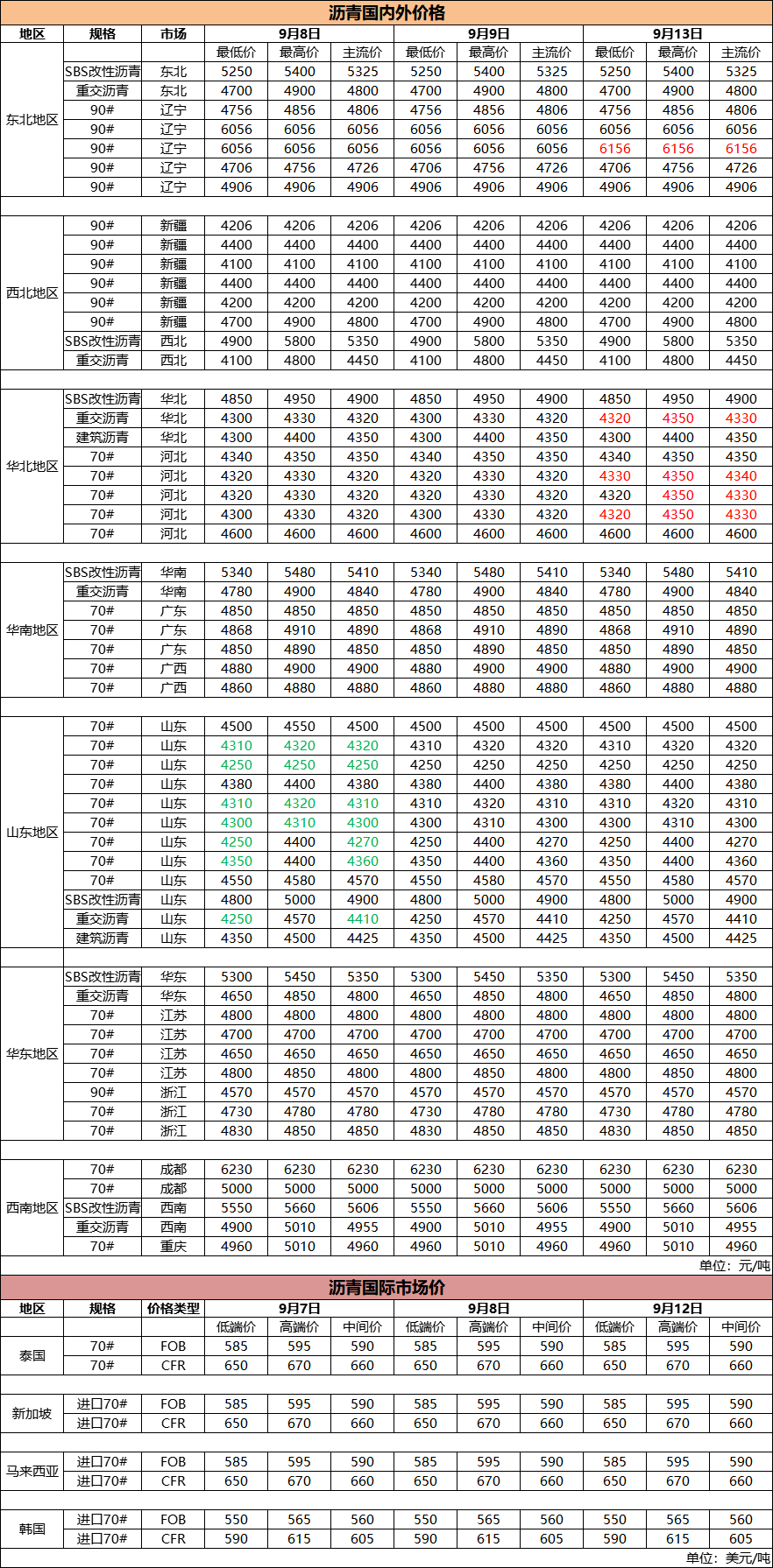 9月13日国内外沥青价格
