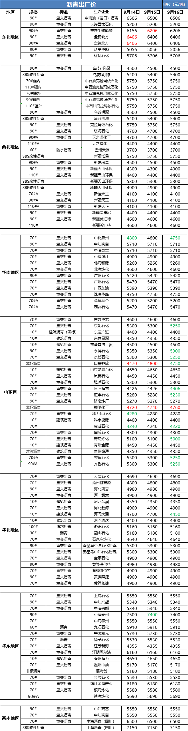 9月16日沥青出厂价