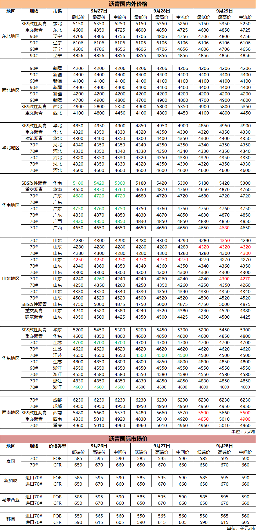 9月29日国内(外)沥青价格