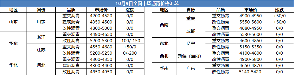 10月9日全国市场沥青价格汇总