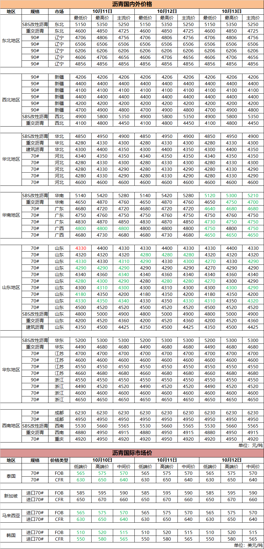 10月13日国内外沥青价格