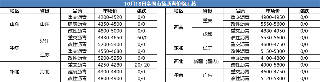 10月18日全国市场沥青价格汇总