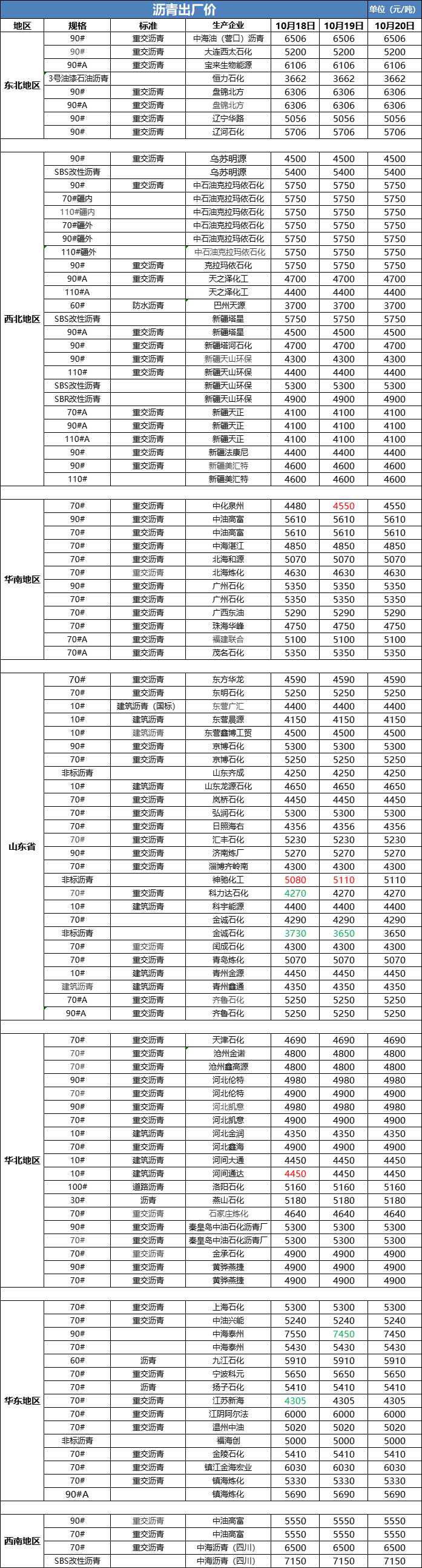 10月20日沥青出厂价