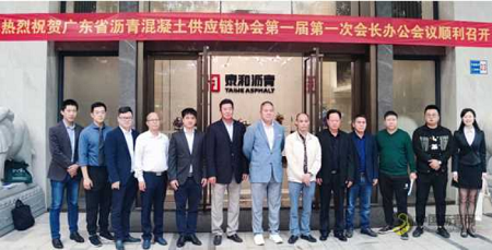 2021年3月9日,广东省沥青混凝土供应链协会第一届第一次会长办公会议在东莞市泰和沥青集团公司总部隆重举行,参加的成员有创始单位深圳海川新材料科技股份有限公司,会长单位广东筑波路桥工程有限公司,副会长单位深圳市鹏进达投资发展有限公司、广东远大建设工程有限公司、广东碧磊建筑工程有限公司、东莞市宏达沥青工程有限公司,监事单位深圳市龙盛工程建设有限公司、河源市恒顺公路工程有限公司、河源市源和丰科技发展有限公司。