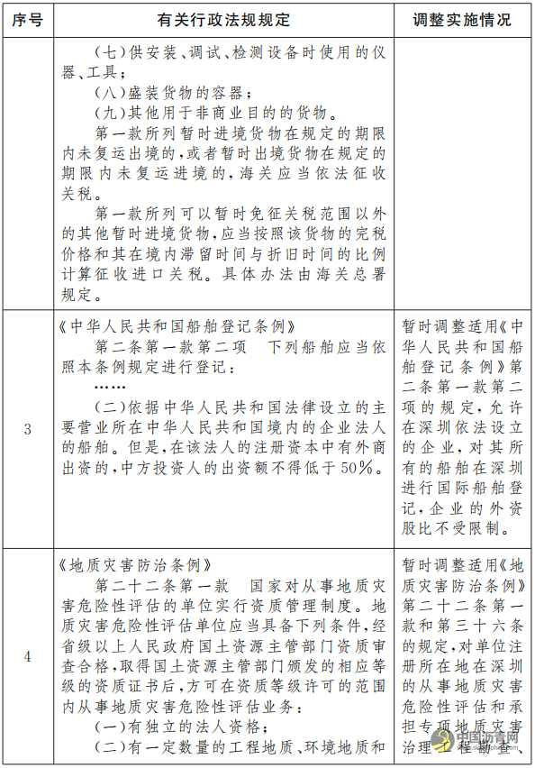 一、按照《深圳建设中国特色社会主义先行示范区综合改革试点实施方案(2020—2025年)》,同意自即日起至2025年12月31日,在深圳市暂时调整实施《中华人民共和国海关事务担保条例》、《中华人民共和国进出口关税条例》、《中华人民共和国船舶登记条例》、《地质灾害防治条例》的有关规定(目录附后)。