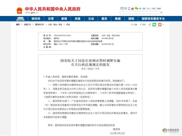 3月17日,中国政府网发布《国务院关于同意在深圳市暂时调整实施有关行政法规规定的批复》,同意自即日起至2025年12月31日,在深圳市暂时调整实施《中华人民共和国海关事务担保条例》、《中华人民共和国进出口关税条例》、《中华人民共和国船舶登记条例》、《地质灾害防治条例》的有关规定,同时要求有关部门、广东省和深圳市人民政府要根据上述调整,及时对本部门、本省(市)制定的有关规章和行政规范性文件作相应调整,建立与深圳建设中国特色社会主义先行示范区综合改革试点工作相适应的管理制度。以下为全文: