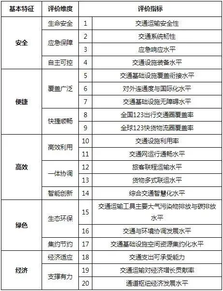 国家综合指标围绕“安全、便捷、高效、绿色、经济”五大基本特征,设置了20项评价指标。其中,“安全”重点从生命安全、应急保障、自主可控3个评价维度设置了4项评价指标;“便捷”重点从覆盖广泛、快捷顺畅2个评价维度设置了5项评价指标;“高效”重点从高效利用、一体协调、智能创新3个评价维度设置了5项评价指标;“绿色”重点从生态环保、集约节约2个评价维度设置了3项评价指标;“经济”重点从经济适用、支撑有力2个评价维度设置了3项评价指标。