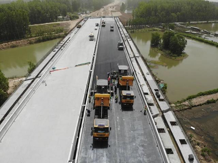 5月7日,济宁环湖大道东线工程太白湖新区段南二环互通主线桥右幅沥青下面层成功铺筑,标志着项目沥青路面施工正式拉开序幕。