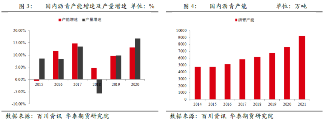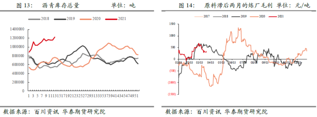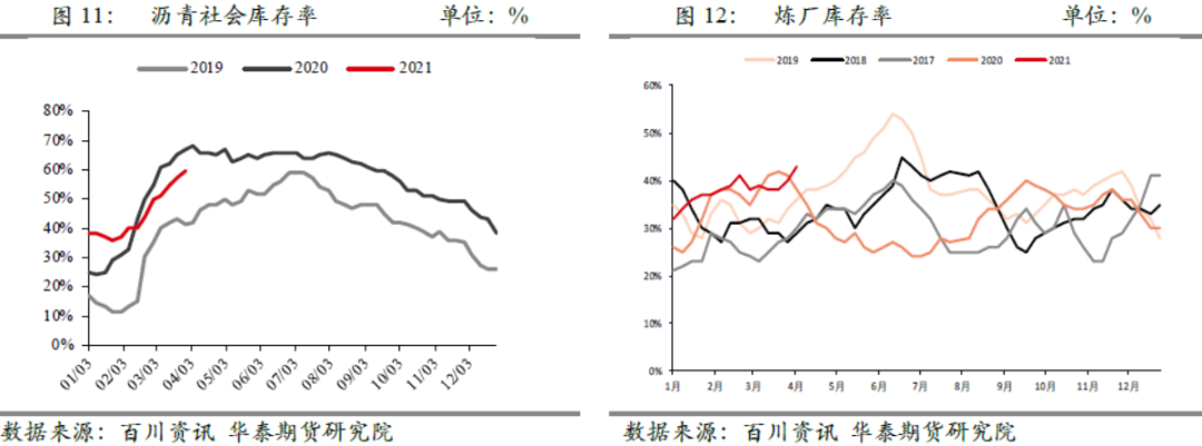 社会库存则处于持续回升周期中,目前社会库存率仅次于去年同期水平,已经大大超过2019年同期水平。就国内沥青库存总量来看,基于去年开始的大量产能投放,供应量增加明显,去年四季度开始,库存增长幅度已经很大,目前绝对库存水平已经是处于历史高位,大大超出近几年同期的库存量。