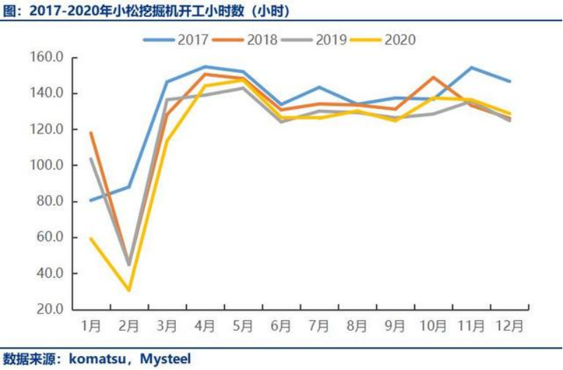 一是下游投资有韧性,挖掘机开工率处于较高水平。从行业下游看,房地产和基建投资保持一定增长。2020年1-11月房地产业固定资产投资完成额同比增长5.0%,6-11月当月同比增速分别为 8.5%、11.7%、11.8%、12.0%、12.7%、10.9%,数据显著优于去年同期。1-11月基础设施建设投资同比增长3.3%,6-11月当月同比增速分别是8.3%、7.7%、7.0%、4.8%、7.3%、5.9%,累计增速持续提升。此外,据komatsu统计,2020年小松中国挖掘机开工小时数总计超1400小时,仍处于较高水平。
