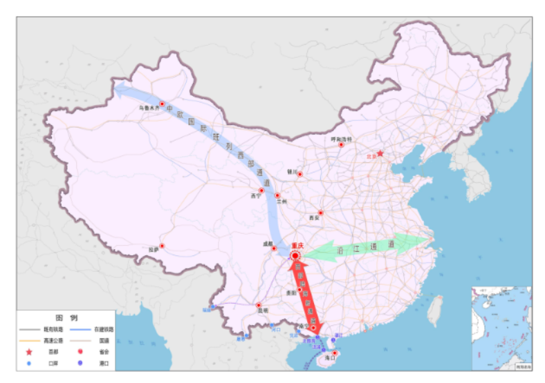 近年来,国家层面加快谋篇布局西部陆海新通道建设。2019年8月,国务院批复实施《西部陆海新通道总体规划》,提出建设自重庆经贵阳、南宁至北部湾出海口(北部湾港、洋浦港),自重庆经怀化、柳州至北部湾出海口,自成都经泸州(宜宾)、百色至北部湾出海口等3条通路,共同形成西部陆海新通道的主通道。2021年国家出台的《国家综合立体交通网规划纲要》,规划布局了“6轴、7走廊、8通道”的国家综合立体交通网主骨架,其中涵盖了西部陆海走廊。西部陆海新通道将把丝绸之路经济带、21世纪海上丝绸之路有机衔接起来,加快形成我国西北与西南地区之间集跨区域联动、陆海联运、物流集聚、通关效能、重大项目建设等为一体的综合性国际贸易大通道。