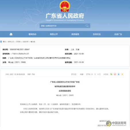 近日,广东省人民政府办公厅印发《广东省城市轨道交通运营突发事件应急预案》。