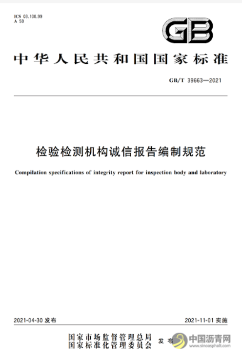 GB/T 39663-2021《检验检测机构诚信报告编制规范》于2021年4月30日经国家市场监督管理总局(国家标准化管理委员会)批准发布,自2021年11月1日起实施。