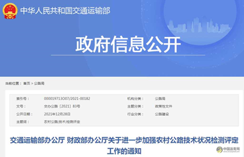 为深入贯彻习近平总书记关于“四好农村路”重要指示精神,认真落实《国务院办公厅关于深化农村公路管理养护体制改革的意见》(国办发〔2019〕45号),做好“十四五”期中央车辆购置税和政府还贷二级公路取消收费后补助等相关资金“以奖代补”工作,加快构建农村公路养护管理长效机制,提升养护管理水平,经交通运输部、财政部同意,现就进一步加强农村公路技术状况检测评定工作有关事项通知如下。