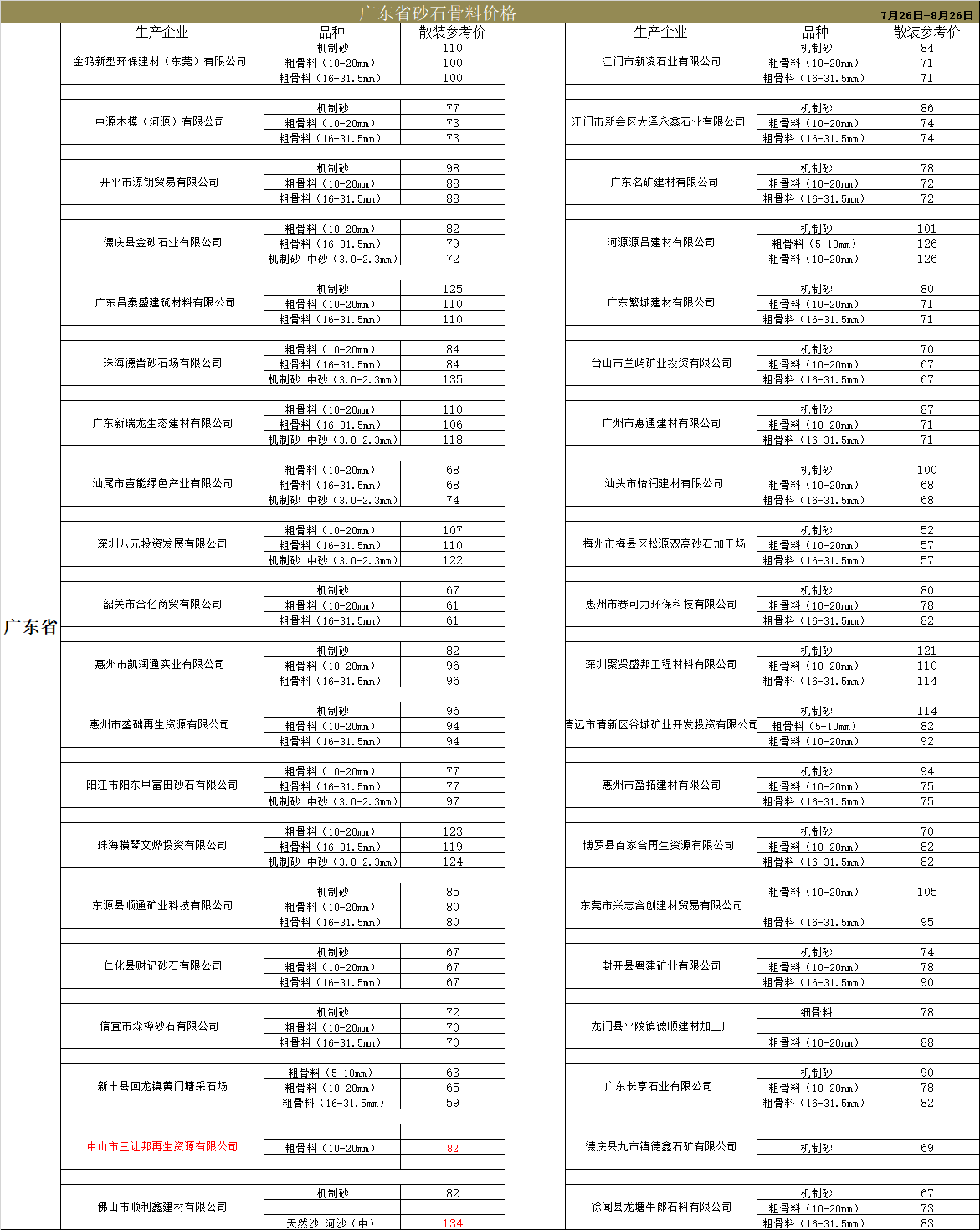 广东省砂石骨料价格