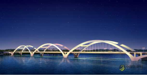 随着丹江口城市发展,中心城区的水都大桥已无法满足交通需求。为打破“一江两岸”经济发展的交通瓶颈,实现“拥江发展、冲刺百强”目标,丹江口市委、市政府决定启动“水都二桥”建设。该桥位于丹江口大坝下游约2.3公里处,总投资约7亿,全长1343米,连接左岸老城区“均州一路”和右岸新城区“石家庄路”,主桥面宽34米,双向四车道+两个非机动车道+两个人行道,建设工期24个月。该项目由丹江口市交通投资有限公司负责建设,湖北省路桥集团有限公司负责施工。主桥采用3跨过江,每跨225米的三跨提篮式系杆钢箱拱桥,如天上的彩虹,产生着一跃而过的动感与跨越感,柔美拱曲线与直线形的梁柱、杆结合,呈现出刚柔并济、韵律优美的绰约风姿,具有“长虹卧波”、“鳌背连云”的特色,一桥雄跨,十分壮观。