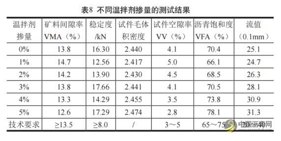 表8中能够看到,在1%温拌剂掺量下,具有最大的空隙率,在5%温拌剂掺量时,具有较低的矿料间隙率与空隙率,增加了工程施工的成本。在3%左右温拌剂掺量条件下,具有与热拌沥青混合料一致的空隙率以及毛体积密度。因此在此次工程施工过程中最佳温拌剂掺量为3%。