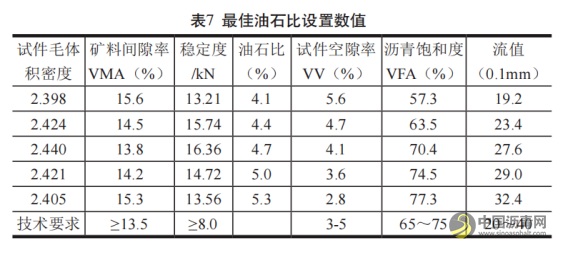在最佳油石比的确定层面上,应用马歇尔配合比设计方法进行,设置160~165℃试件成型温度,进行75次双面击实。