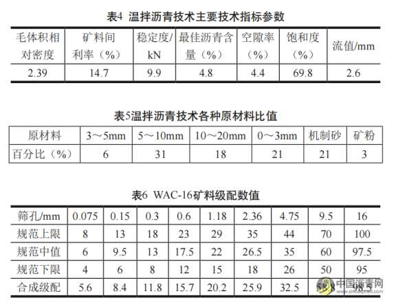 温拌沥青技术应用过程中要求设置最佳的配比,主要技术参考指标与比值见表4~6。