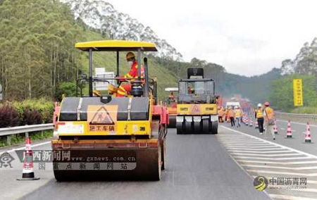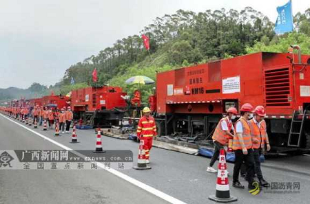 防城至东兴高速公路复拌式就地热再生路面施工技术观摩现场。广西新闻网通讯员 唐周杰 供图