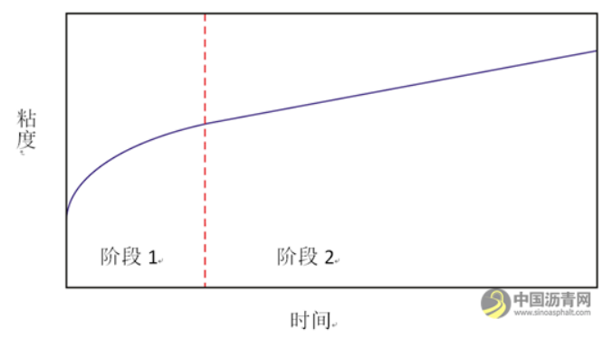 沥青粘结剂的老化发生在沥青混合料的生产过程中,以及在使用过程中暴露在周围大气环境中。当沥青混合料在非常高的温度下生产时,老化的第一阶段以非常快的速度发生。这个阶段通常被称为短期老化。在这一阶段,一层非常薄的沥青薄膜在高温下暴露在空气中,导致沥青粘合剂的流变性能发生显著变化。这种变化表现在高粘度和增加的硬度。第二阶段的老化发生在沥青作为在役路面结构长期暴露在相对较低的温度中。硬化速度取决于混合料的空隙含量和周围环境。图中显示了未改性沥青的典型硬化响应。由于短期老化(阶段2),沥青粘结剂的黏度有一个跳跃,而随着时间的增加,黏度有一个较低的恒定速率的线性增加(阶段2)。阶段2代表长期老化导致的硬化。