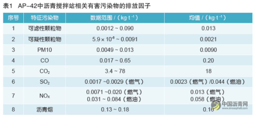 美国每年大约要生产和铺设5~5.5亿t沥青混合料,现有大约4500个沥青搅拌站[5,6]。美国《清洁空气法》(CAA)要求污染气体的排放必须获得专门的许可证,新建沥青搅拌站或现有搅拌站改造必须通过审查,其排放量必须满足国家有害空气污染物排放标准(NESHAP)和各州各地区的排放要求及控制技术要求。在严格的法律法规和排放标准管控下,美国沥青工厂的排放量比较低,温室气体的排放也控制得非常好。据美国国家沥青路面协会(NAPA)统计,自1970年以来,沥青行业已经将总排放量减少了97%,但沥青产量增加了250%。2000年,美国国家环境保护署(EPA)对热拌沥青搅拌站作了调查评估报告,认为沥青搅拌站只是工业污染的次要来源[7]。但是,气味排放是沥青路面行业非常关注的问题,在沥青搅拌站的施工运行或铺路作业期间散发的热拌沥青的恶臭味会严重影响周围环境的舒适性,对于工人来说,长期接触无疑是非常有害健康的[8]。EPA自1972年以来定期更新AP-42排放因子数据库,2004年AP-42第11章节新增了沥青搅拌站的排放因子和研究报告,为沥青搅拌站污染气体排放量的计算提供理论依据[9,10]。AP-42排放因子数据库中涉及沥青搅拌站的主要特征。排放因子数据库如表1所示[10,11]。