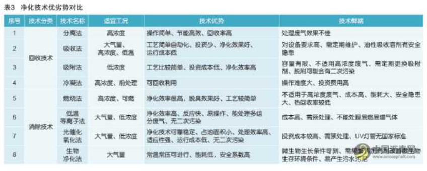 针对沥青烟的末端治理,目前主要有回收类技术和消除类技术两类。回收类技术主要有分离法、吸收法、吸附法和冷凝法;消除类技术主要包括燃烧法、低温等离子法、光催化氧化法和生物净化法。表3梳理了各净化方法的优缺点及适用工况。从搅拌站烟气的组分、回收价值、二次污染、净化技术的可行性、安全性和经济性等方面考虑,不推荐使用吸收法和膜分离法。对于冷凝法,储罐区可继续沿用该技术;对于吸附法,目前常用的吸附剂是活性炭,但由于目前吸附剂的脱附技术不成熟,活性炭需要定期跟换等需要很高的维护费用,如采用其他的吸附剂也需要考虑二次污染的处理问题;生物法处理废气是在污水治理的基础上发展起来的,在国外有一定的应用规模,生物法能耗低,没有二次污染,但生物法占地面积大、净化周期长、对净化环境要求高以及微生物菌群的培养需要耗费较多时间,对整个系统的温度、压强、酸碱环境和碳源等要求严格,其净化周期、运行精细度等不适合生产相对粗放的沥青搅拌站,暂不推荐在搅拌站沥青烟气的净化应用;燃烧法是处理沥青烟气的高效手段,但直接引入烘干滚筒燃烧烟气量大,破坏原有的燃烧-烘干-除尘系统,影响整机的生产效率;低温等离子、UV光催化是目前各搅拌站厂家主推的净化技术,但单一的治理技术难以达到治理要求,需要采用多技术组合对沥青烟气进行净化。通常UV光催化氧化技术和低温等离子技术协同使用能明显提高净化沥青烟的效率,烟气在进入UV光催化设备前也应进行一定的预处理,否则粘附在UV灯管上的粉尘等会对后期设备运行和维护工作造成一定的影响。