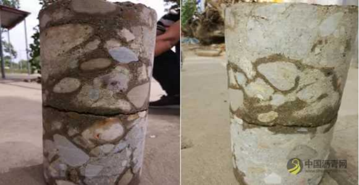 通过芯样分析:均质化施工后上基层水稳上半部分不裂,下半部分有斜向裂纹,达到均质化再生技术要求效果,如图15所示。