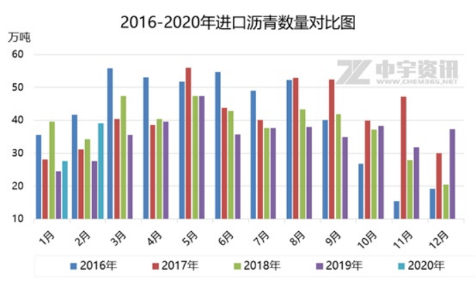 据海关数据显示,2020年1-2月份进口沥青总量约在66.74万吨,同比去年52.21万吨,增加14.52万吨,增幅27.81%,从往年数据来看,由于去年同期沥青产量大幅提升,导致1-2月份进口总量创近五年新低,而2020年1-2月份受制于疫情利空风险限制,下游工程建设恢复周期延长,令炼厂沥青库存高位难以释放,多数炼厂为规避价格下行风险,下降开工率,但原油期货行情走低,令进口沥青价格下滑明显,对国内部分地区高端价格形成套利空间,因此部分进口商外采力度有所提升,进口数量较去年同期出现明显上涨,但从历史数据来看表现相对稳定,1-2月份进口总量并未创出近几年新高,处于往年中等水平。