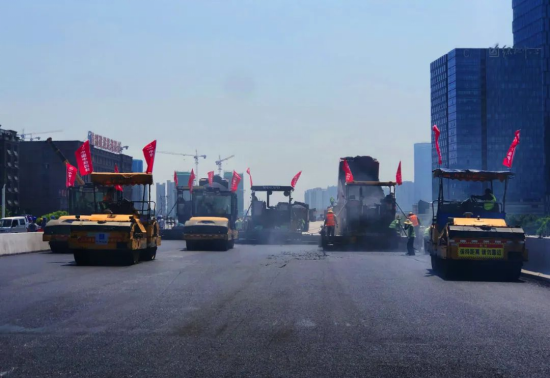 现场管理人员严格按照标准化作业,对摊铺速度、摊铺厚度、碾压次数以及碾压效果严格要求,同时对施工质量严格把控,试验段结束后及时采集各项数据,确保畅通二环(西南环)宿松路节点工程主线高架桥钢箱梁试验段摊铺工作顺利完成。