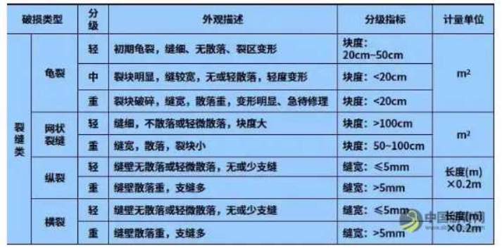 根据沥青路面的破损程度,病害分为轻、中、重三个等级,具体分类与分级见下表。