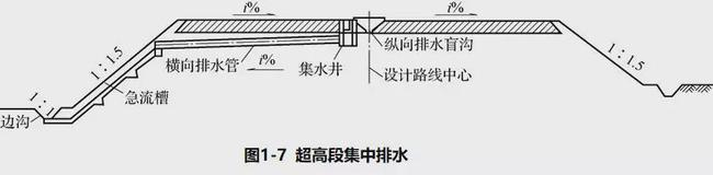 对于新建高速公路超高段的集中排水,宜采用在左侧路缘带的左侧设置带有钢筋混凝土盖板的预制整体式U形混凝土沟或缝隙式排水沟,每25~50 m设一处集水井,并通过横向排水管引至边坡的急流槽或暗管中,如图1-7所示。