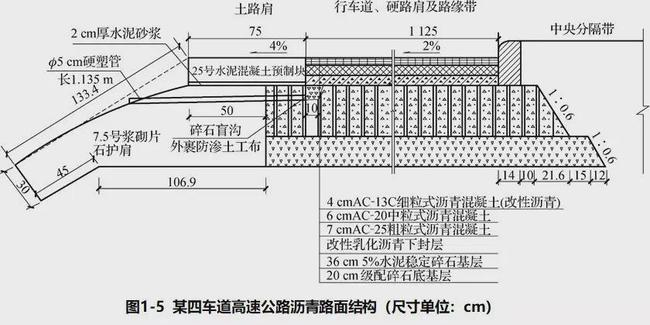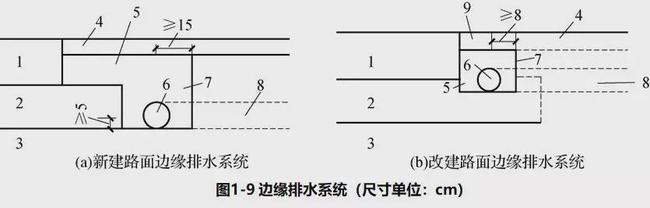 1)路面边缘排水系统由纵向排水管、横向出水管、集水沟和反滤织物(土工布)等组成,如图1-9所示。